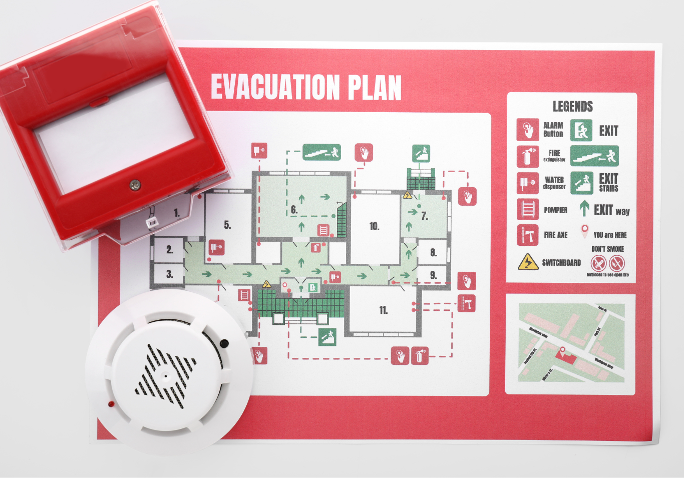 - Les organes de sécurité, les chemins d’évacuations, les issues de secours et le point de rassemblement.
